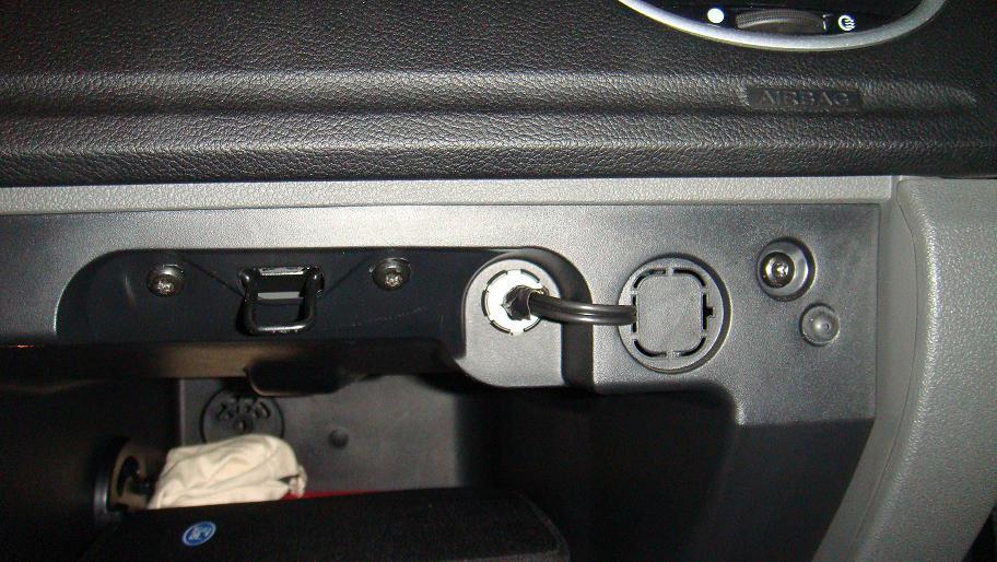 Ανοίγουμε το ντουλαπάκι. Σε περίπτωση που είναι ψυχόμενο, κλείνουμε τον διακόπτη γυρνώντας με το δεξί μας χέρι προς τα δεξιά (σαν το ρολόι). Ανοίγουμε τις τρεις μικρές τάπες στο κάτω μέρος από το ντουλαπάκι κ χρησιμοποιώντας το κατσαβίδι, ξεβιδώνουμε όλες τις βίδες πάνω κ κάτω (σύνολο 7: 4 επάνω, 3 κάτω). Με προσοχή, τραβάμε λίγο προς τα έξω το ντουλαπάκι (το "παίζουμε" ταυτόχρονα αριστερά-δεξιά για να βγει πιο εύκολα, προσέχοντας μην τραβήξουμε απότομα κ σπάσουμε τον σωλήνα του a/c που οδηγεί στο ντουλαπάκι). Προσέχουμε τα καλώδια από την ενσωματωμένη θύρα AUX. Πιέζουμε το κλιπ που ενώνει τη θύρα με τα καλώδια κ απελευθερώνουμε τα καλώδια. Βγάζουμε τελείως το ντουλαπάκι (παρατηρούμε το χάος σωληνώσεων κ καλωδιώσεων που υπάρχει στο συγκεκριμένο σημείο, εκεί βρίσκεται η ασφαλειοθήκη, κάτι που σημαίνει ότι χρειάζεται προσοχή στις κινήσεις μας).